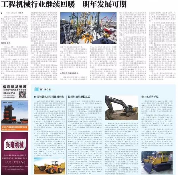 我國工程機(jī)械企業(yè)整體產(chǎn)品銷量在2016年三季度以來得到大幅回暖,相關(guān)人士分析表示,回暖將繼續(xù)延續(xù)至2017年1季度。