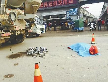 老人的遺體被藍色塑料布蓋著,一邊還有一個紅色塑料袋,里面放著老人剛從集市買的棉衣和棉褲,事發(fā)現(xiàn)場附近立著兩個警示栓,攪拌車停在遺體旁邊,司機在車內(nèi)。此時,在不遠處集市上賣水果的,老人的小兒子已經(jīng)趕到現(xiàn)場,他情緒悲痛,正在配合民警做調(diào)查。