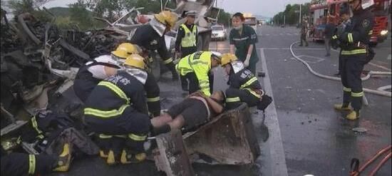 由于駕駛室變形嚴(yán)重,救援難度較大,為全力救出被困者,消防官兵首先利用擴(kuò)張器從左側(cè)車門擴(kuò)張,而后用撐頂桿對(duì)壓住被困者的變形車窗中間部位一點(diǎn)一點(diǎn)進(jìn)行擴(kuò)張,并小心翼翼地挪動(dòng)被困者的身體,發(fā)現(xiàn)車門位置已經(jīng)變形卡主被困人員,現(xiàn)場(chǎng)指揮員果斷命令用無(wú)齒鋸對(duì)車門部位切割并用戰(zhàn)斗服蓋住被困人員防止?fàn)C傷,水槍一直保持充實(shí)水柱狀態(tài)。