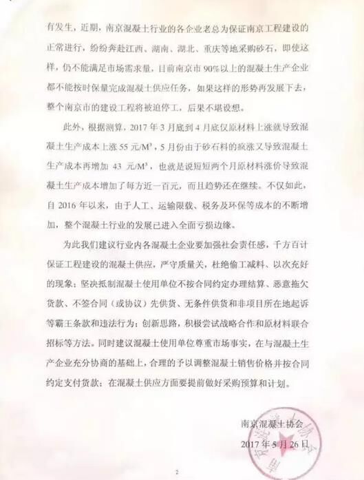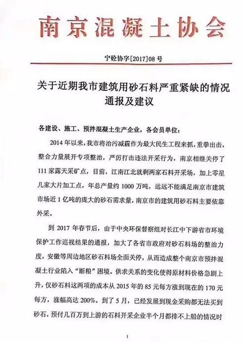5月26日,南京混凝土協(xié)會(huì)關(guān)于近期南京市建筑用砂石料嚴(yán)重緊缺的情況發(fā)布通報(bào)及建議。公告中提到:目前江南江北僅剩的兩家石料開(kāi)采場(chǎng)遠(yuǎn)遠(yuǎn)不能滿(mǎn)足南京市建筑市場(chǎng)近1億噸的砂石需求量,全市建筑用砂石料主要依靠外采。尤其是在今年春節(jié)以后,中央環(huán)保督察組對(duì)長(zhǎng)江中下游省市環(huán)境保護(hù)巡視結(jié)果的通報(bào),加大了各省市政府對(duì)砂石料場(chǎng)的整治力度,周邊地區(qū)砂石料場(chǎng)全面關(guān)停,從而造成全市預(yù)拌混凝土行業(yè)陷入“斷糧”的困境,這也直接導(dǎo)致原材料價(jià)格急劇上升。