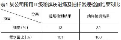 優(yōu)質(zhì)的粉煤灰摻入混凝土可明顯地改善混凝土的和易性,當(dāng)粉煤灰摻量大于膠材總量的5%~10%時,效果極為明顯?,F(xiàn)今在混凝土實際生產(chǎn)中,粉煤灰摻量往往達到20%,有的甚至高達30%,但混凝土的和易性卻不盡人意。抽取原材料進行檢測時,發(fā)現(xiàn)粉煤灰的檢測結(jié)果經(jīng)常不滿足標(biāo)準(zhǔn)要求或者與驗收時的結(jié)果相差甚遠(yuǎn)?,F(xiàn)以某公司所用Ⅱ級粉煤灰進場及抽樣常規(guī)檢測結(jié)果進行對比,見表1。