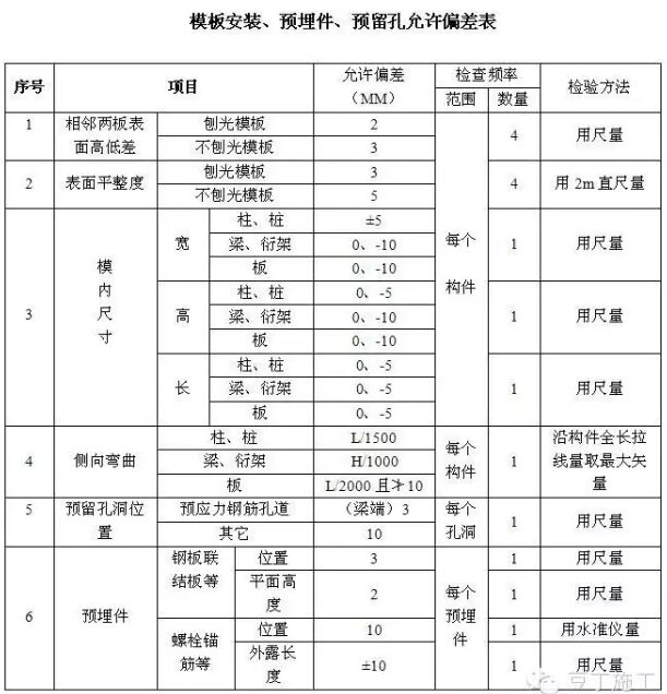 模板安裝、預(yù)埋件及預(yù)留孔施工允許偏差見(jiàn)《模板安裝、預(yù)埋件、預(yù)留孔允許偏差表》