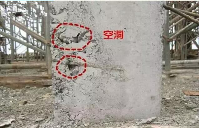 由于混凝土灌注時有一些部位堵塞不通,構件中就會產(chǎn)生空洞,空洞不同與蜂窩,蜂窩的特征是存在于未搗實的混凝土或缺水泥漿;而空洞卻是局部或全部沒有混凝土??斩吹某叨韧ǔ]^大,以至于鋼筋全部裸露,造成構件內(nèi)貫通的斷缺以至于結構發(fā)生整體性破壞。