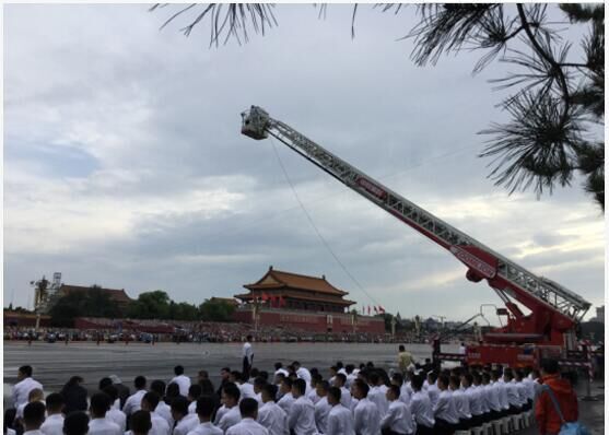 此外,為滿足各種拍攝條件,央視還精選了中聯(lián)重科56米泵車和32米云梯消防車。56米泵車可謂是大號“攝像搖臂”,在其臂架前端架設(shè)攝像機(jī)輔助拍攝閱兵隊伍行進(jìn)的動態(tài)長鏡頭。32米云梯消防車則是超高的“拍攝平臺”,央視的“長頸鹿攝像機(jī)”架設(shè)在高度32米的消防平臺上,攝像師站在平臺上捕捉受閱裝備彎道轉(zhuǎn)彎的精彩畫面,體現(xiàn)鋼鐵洪流卷起滾滾烽煙。在前期,云梯消防車還承擔(dān)了輔助架設(shè)“天鷹”的重任。