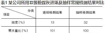 優(yōu)質(zhì)的粉煤灰摻入混凝土可明顯地改善混凝土的和易性,當(dāng)粉煤灰摻量大于膠材總量的5%~10%時,效果極為明顯?,F(xiàn)今在混凝土實(shí)際生產(chǎn)中,粉煤灰摻量往往達(dá)到20%,有的甚至高達(dá)30%,但混凝土的和易性卻不盡人意。抽取原材料進(jìn)行檢測時,發(fā)現(xiàn)粉煤灰的檢測結(jié)果經(jīng)常不滿足標(biāo)準(zhǔn)要求或者與驗(yàn)收時的結(jié)果相差甚遠(yuǎn)?,F(xiàn)以某公司所用Ⅱ級粉煤灰進(jìn)場及抽樣常規(guī)檢測結(jié)果進(jìn)行對比,見表1。