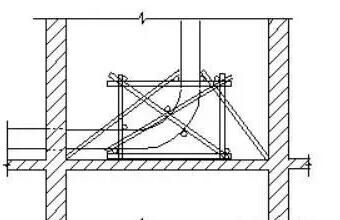 1.泵管隨層接,澆注墻體及柱混凝土?xí)r,端頭軟管放在該施工位置的操作架上,輸送管路必須使?jié)补嗖课辉诠ぷ靼霃街畠?nèi)。由于留洞口到操作位置需接90o彎管和平直管,保證平直管高出模板頂1M,彎管及平直管必須臨時固定牢固,搭設(shè)類似前圖所示的固定架子,保證泵管穩(wěn)定。