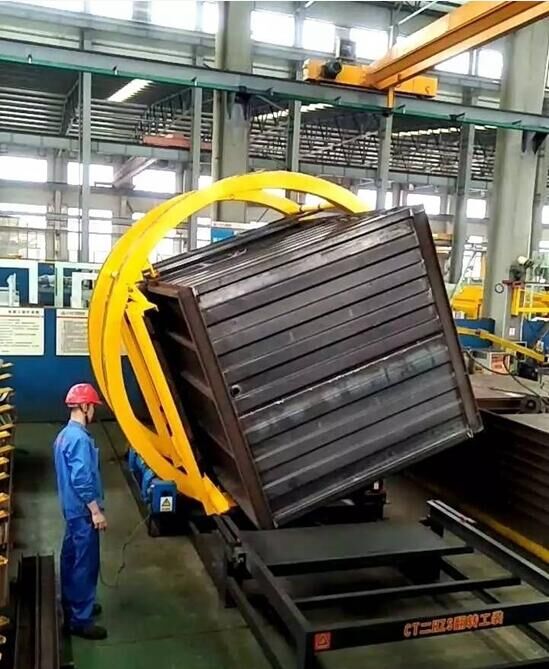 該工裝適用于HZS系列混凝土攪拌站所有水箱、外加劑箱、控制室生產(chǎn)過程中的翻轉(zhuǎn)焊接。工裝工件采用軌道輸送,四角螺旋定位,平穩(wěn)快速;可調(diào)節(jié)過渡軌道,可移動踏板,方便快捷,安全可靠。