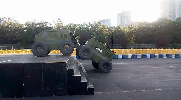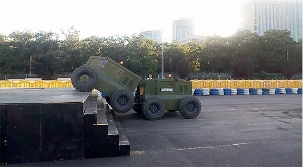 在翻越障礙物的過程中,車體姿態(tài)靈活變化,輕松攀越高臺,現場驚嘆與掌聲不斷。