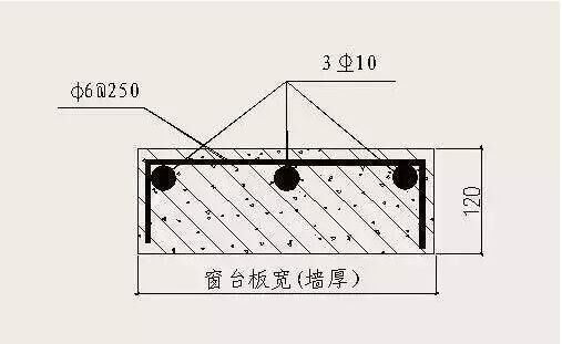 對于砌體墻,外窗洞下口必須澆筑寬與墻厚相同、高度不小于120mm、長度每邊伸入墻內(nèi)不少于400mm(不足400mm時(shí)通長設(shè)置)的混凝土窗臺板(針對窗臺下砌體八字縫措施),已設(shè)鋼筋混凝土凸窗套或窗臺板者除外。窗臺板為C20混凝土,內(nèi)配3Φ10主筋和φ6@250U型分布筋。