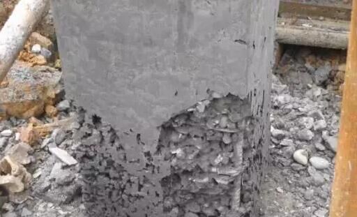 混凝土柱爛根初步處理方案可以采取灌漿法修補(bǔ),材料使用MEK-40灌漿料,施工流程為:舊混凝土鑿毛→用清水沖洗飽和→灌注、涂抹灌注漿體→養(yǎng)護(hù)。