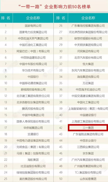 近日,國家信息中心發(fā)布了《”一帶一路”大數(shù)據(jù)報告(2017)》,首次評選出“一帶一路”企業(yè)影響力50強(qiáng)榜單,三一集團(tuán)排名第42位。
