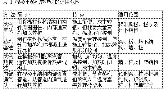 蒸汽法養(yǎng)護按照不同的加熱方式可以分為蒸汽室法、蒸汽套法、毛管模板法、蒸汽熱模法和內(nèi)部通氣法,其特點及使用的范圍見表 1。