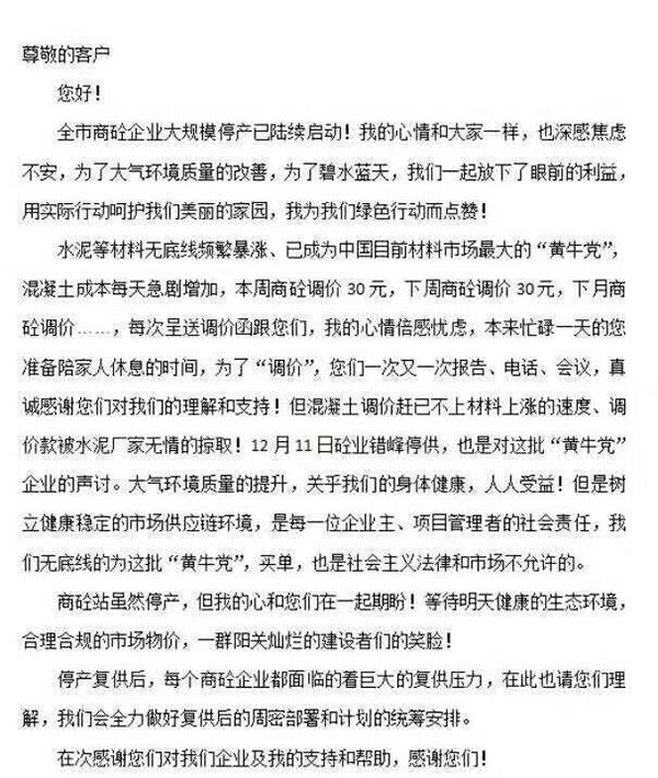 決議除了請求政府干預(yù)價格之外,還要求會員單位堅決抵制因價格波動采取惡意低價競爭搶占市場的行為;要求會員單位與施工單位及時溝通,在雙方因價格調(diào)整未達成一致且合同未終止前,其他企業(yè)一律不得低價介入;要求各片區(qū)響應(yīng)政府環(huán)保要求,及時采取錯峰生產(chǎn)、停產(chǎn)限產(chǎn)等措施。