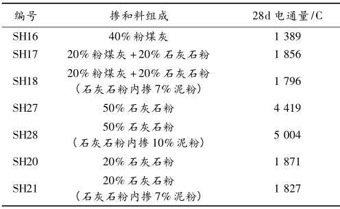 研究發(fā)現(xiàn)摻加石灰石粉對混凝土的抗氯離子滲透性有一定的不利影響,但摻量為20%時影響不大,一定的含泥量也不影響電通量的測試結(jié)果。當(dāng)摻量達(dá)到50%時,混凝土抗氯離子滲透性能顯著降低,且10%的含泥量對測試結(jié)果也產(chǎn)生一定影響。