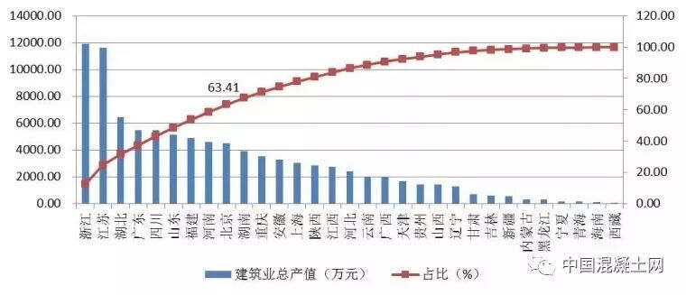 除浙江、江蘇兩省外,總產(chǎn)值超過4000億元的還有湖北、廣東、四川、山東、福建、河南和北京共7個地區(qū),上述9省市完成的建筑業(yè)總產(chǎn)值占全國建筑業(yè)總產(chǎn)值的63.41%(圖1)。