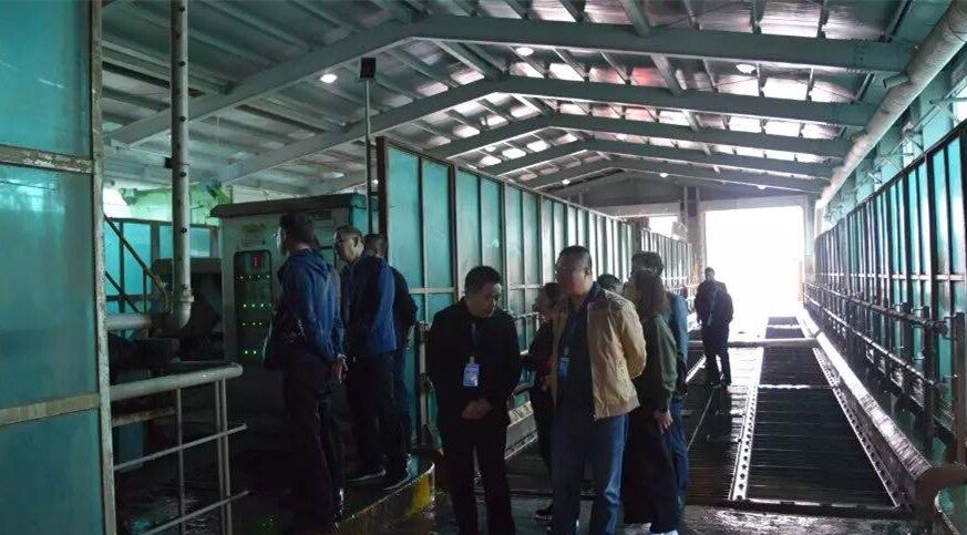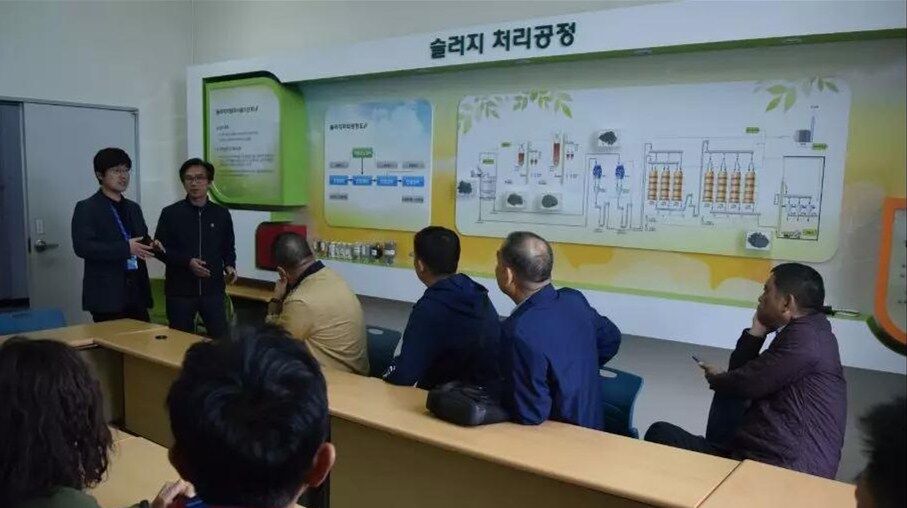 10日下午考察團一行到達韓國最大的垃圾填埋廠,首先參觀生活食品垃圾運輸車輛沖洗設(shè)備,此套設(shè)備由兩組車輛沖洗線構(gòu)成,每條線長度為50米,當車輛駛?cè)胫粮袘獏^(qū)設(shè)備自動啟動對車輛全方位立體式?jīng)_洗,沖洗中掉落的異物經(jīng)特制排泥裝置送至中央皮帶輸送機。車輛完成沖洗后駛出前對車身噴淋消毒去異味藥劑,最后烘干后離開。每日完成一千車次的清洗消毒工作。