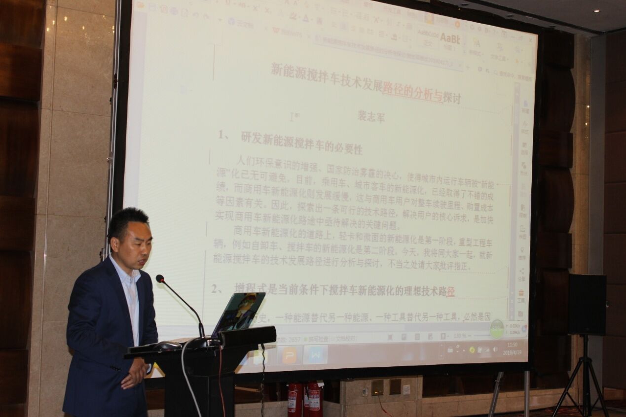 安徽星馬專(zhuān)用汽車(chē)有限公司總經(jīng)理助理裴志軍先生從國(guó)內(nèi)外攪拌車(chē)的發(fā)展現(xiàn)狀出發(fā),作了“增程式是當(dāng)前條件下攪拌車(chē)新能源化的理想技術(shù)路徑”和“增程式在攪拌車(chē)上應(yīng)用前景展望”的《新能源攪拌車(chē)技術(shù)發(fā)展路徑的分析與探討》報(bào)告。