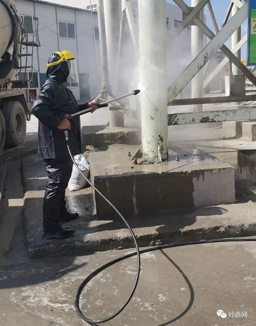 在楊技術(shù)員給站上工作人員進(jìn)行初步講解指導(dǎo)后,首先對兩年沒有清理過的水泥倉支腿下方累積的混凝土進(jìn)行了處理。那么,效果究竟怎么樣呢?具體視頻關(guān)注“砼商網(wǎng)”公眾號,回復(fù)“高壓清洗機(jī)”即可獲得技術(shù)員正準(zhǔn)備打攪拌機(jī)主樓容易噴濺混凝土的地方時(shí)該攪拌站站長說道,這可得有兩年沒清理過的混凝土結(jié)塊,十幾公分厚呀!你們這高壓清洗機(jī)能打掉嗎?這是混凝土??!這么長時(shí)間了,還這么厚,打不下去怎么辦?正在小編心里打鼓的時(shí)候,楊技術(shù)員說道,沒問題,放心吧!