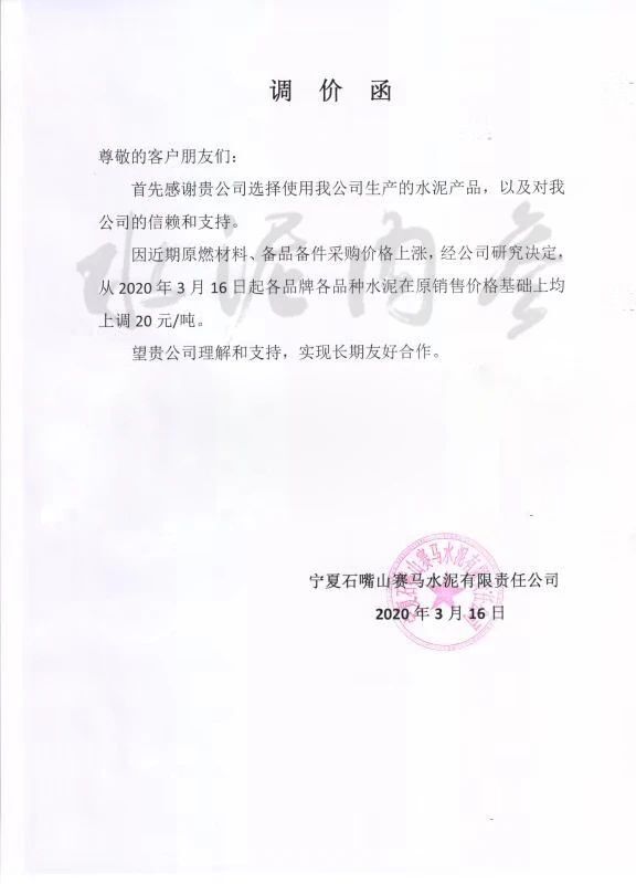 此前,寧夏賽馬水泥有限公司發(fā)布通知,稱(chēng)由于近期原燃料、備品備件采購(gòu)價(jià)格上漲,公司決定自3月16日起各品牌、各品種水泥在原有價(jià)格基礎(chǔ)上上調(diào)20元/噸。