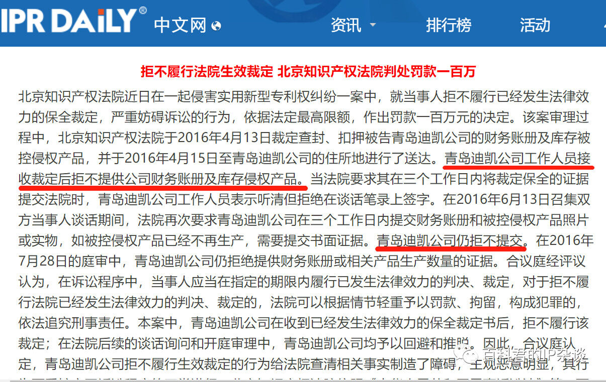 具體點就是,迪凱公司無正當理由,拒絕按照保全裁定提供相關證據(jù)(甚至還曾被判處罰款100萬),應當承擔相應的不利后果,從而推定上述主張成立。