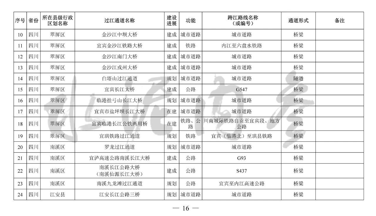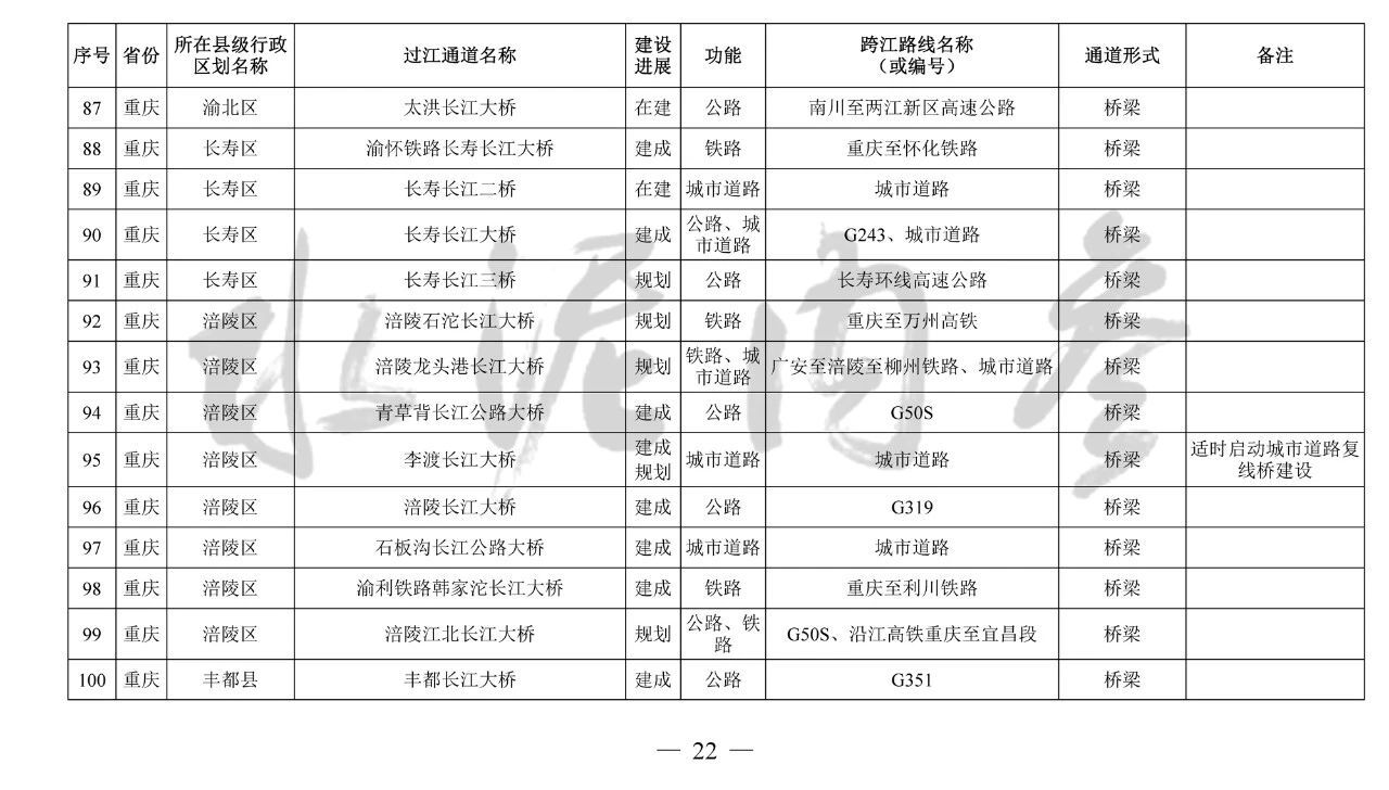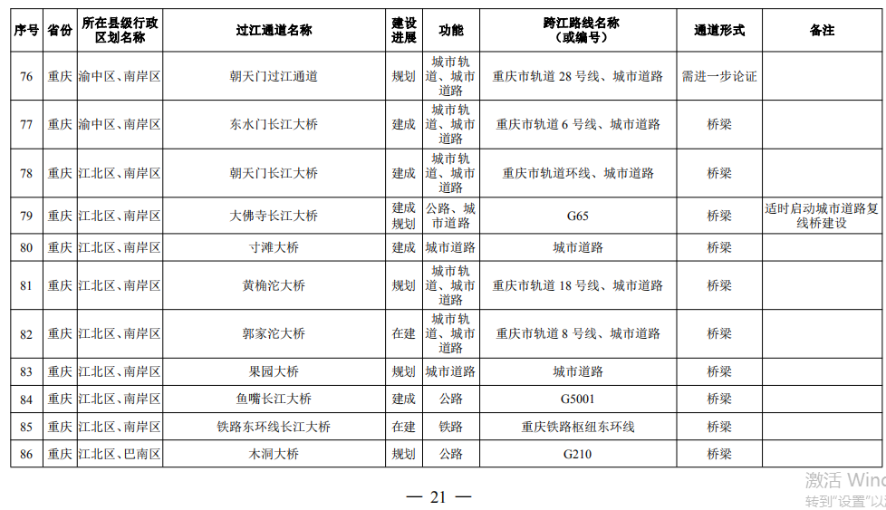 重慶市(17座):市域(郊)鐵路跳蹬至江津線長江大橋、西彭長江大橋(支坪長江大橋)、小南海長江大橋、中壩過江通道、黃桷坪長江大橋、軌道27號線過江通道、重慶至黔江鐵路過江通道、黃桷沱大橋、長壽長江三橋、涪陵石沱長江大橋、涪陵龍頭港長江大橋、涪陵江北長江大橋、興義長江大橋、西沱長江大橋、云陽復興長江大橋、奉節(jié)二橋、巫山長江二橋