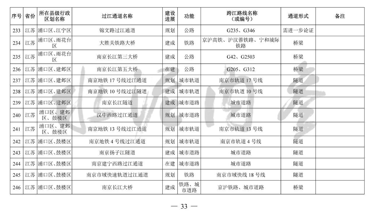 江蘇?。?3座):錦文路過江通道、南京地鐵4號線過江通道、南京市域快速軌道過江通道、南京上元門過江通道、南京七鄉(xiāng)河過江通道、龍?zhí)堕L江大橋、寧儀城際鐵路過江通道、潤揚第二過江通道、江陰第二過江通道、江陰第三過江通道、張皋過江通道、蘇通第二過江通道、海太過江通道