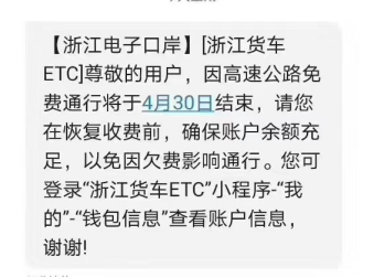 今天,很多浙江ETC用戶卡友收到同樣一條短信,短信的內(nèi)容大致是:因高速公路免費(fèi)通行將于4月30日結(jié)束,請大家保持賬戶余額充足。