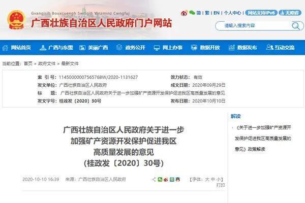 近日,廣西壯族自治區(qū)人民政府發(fā)布《關(guān)于進(jìn)一步加強(qiáng)礦產(chǎn)資源開(kāi)發(fā)保護(hù)促進(jìn)我區(qū)高質(zhì)量發(fā)展的意見(jiàn)》,針對(duì)自治區(qū)礦業(yè)開(kāi)發(fā)布局不合理、規(guī)?;讲桓?、粗放利用和生態(tài)環(huán)境保護(hù)不到位等問(wèn)題提出若干建議,努力加強(qiáng)礦產(chǎn)資源開(kāi)發(fā)保護(hù),提高礦產(chǎn)資源有序開(kāi)發(fā)和綜合利用水平。