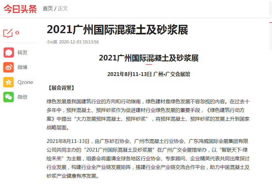 廣州國際混凝土及砂漿展已于2020年成功舉辦,自項目立項以來,得到多方媒體的關注和報道。據(jù)統(tǒng)計,2020-2021年度,騰訊視頻、愛奇藝、土豆網(wǎng)、優(yōu)酷視頻等電視媒體,網(wǎng)易房產(chǎn)、新浪家居、廣州搜狐焦點、騰訊網(wǎng)、中國數(shù)字經(jīng)濟網(wǎng)、央廣網(wǎng)、360慧聰網(wǎng)、南方網(wǎng)、北方網(wǎng)、羊城晚報、廣州日報、新浪網(wǎng)、新京報、21世紀經(jīng)濟報道、東方網(wǎng)、光明網(wǎng)、中國商業(yè)新聞網(wǎng)、焦點中國網(wǎng)等主流媒體,抖音、快手、西瓜視頻、今日頭條、百家號、火山小視頻等視頻媒體和廣東建設報、中國路面機械網(wǎng)、新型砂漿網(wǎng)、世界機械網(wǎng)、工程機械在線、攪拌設備網(wǎng)、中國保溫砂漿網(wǎng)等行業(yè)媒體,以及《混凝土雜志》、《砼時代》等雜志媒體均對展會給予高度關注,積極宣傳展會動態(tài)與資訊。感謝各行業(yè)媒體、主流媒體、視頻媒體、雜志的大力支持與高度認可。