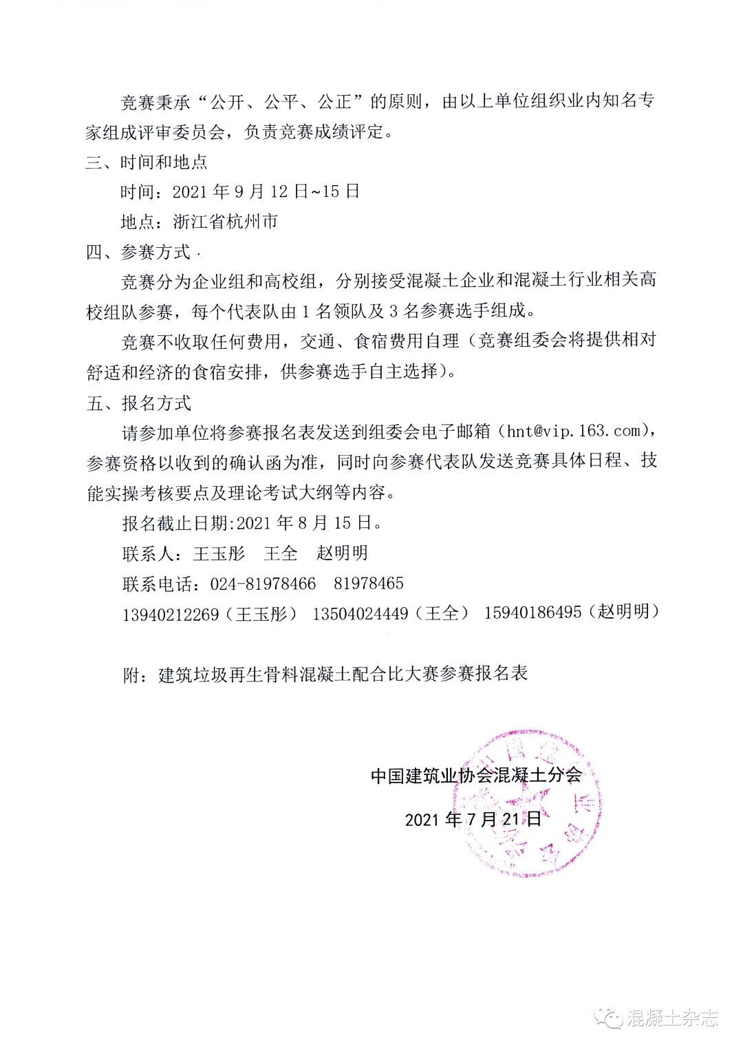 為配合《住房和城鄉(xiāng)建設(shè)部關(guān)于推進建筑垃圾減量化的指導(dǎo)意見》(建質(zhì)〔2020〕46號)的發(fā)布,進一步推動混凝土行業(yè)建筑垃圾消納和碳減排,為我國2030年前實現(xiàn)碳達峰、2060年前實現(xiàn)碳中和的目標做出混凝土行業(yè)的貢獻,現(xiàn)決定于2021年9月12日~15日于浙江省杭州市舉辦建筑垃圾再生骨料混凝土配合比大賽。