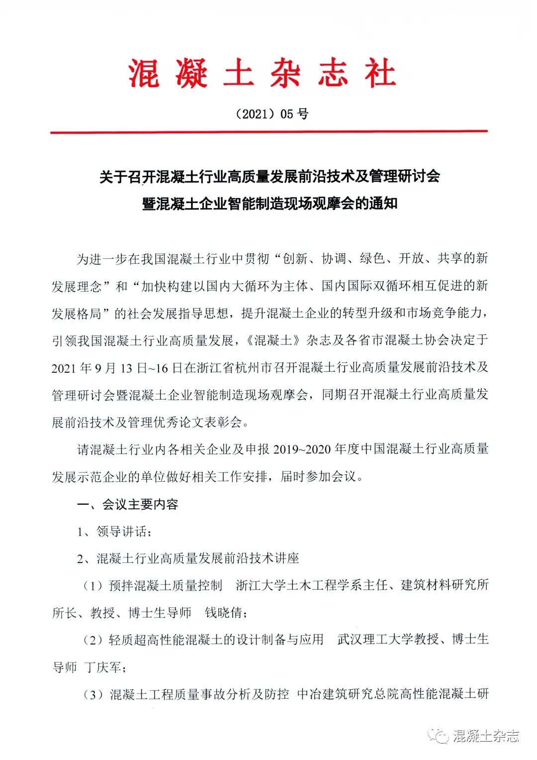 (9.13杭州)關(guān)于舉辦混凝土行業(yè)高質(zhì)量發(fā)展前沿技術(shù)及管理研討會暨混凝土企業(yè)智能制造現(xiàn)場觀摩會的通知