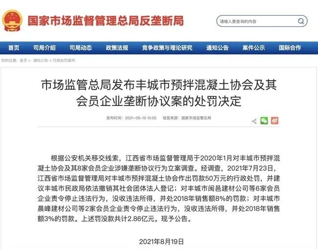 8月18日,國家市場(chǎng)監(jiān)管總局發(fā)布通報(bào),江西省市場(chǎng)監(jiān)督管理局對(duì)豐城市預(yù)拌混凝土協(xié)會(huì)及其會(huì)員企業(yè)壟斷協(xié)議一案,合計(jì)罰沒約2.86億元。