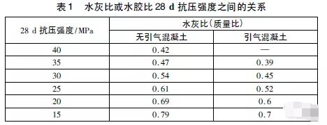 當(dāng)無試驗資料可用時,對于含有Type1波特蘭水泥(硅酸鹽水泥)的混凝土,可以在表1中得到近似和相對固定的數(shù)據(jù)。用有代表性的材料,在試驗室標(biāo)準(zhǔn)養(yǎng)護條件下試驗28d的試塊,表1中的水膠比可以得到與之對應(yīng)的強度。