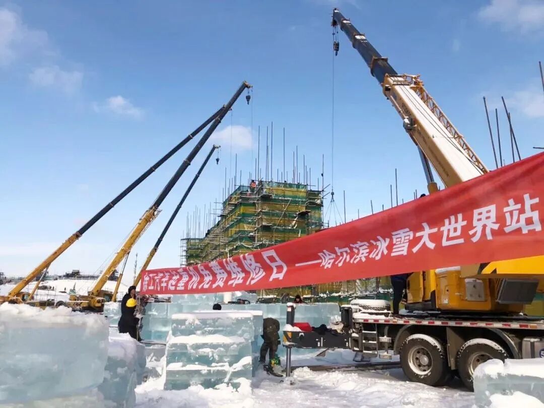 第21屆哈爾濱冰雪大世界建設現(xiàn)場,XCT25、QY25K5-1、QY70k-1在內的50多臺徐工起重設備將無數(shù)個“量重面滑”、重達一噸的冰塊無縫堆砌。