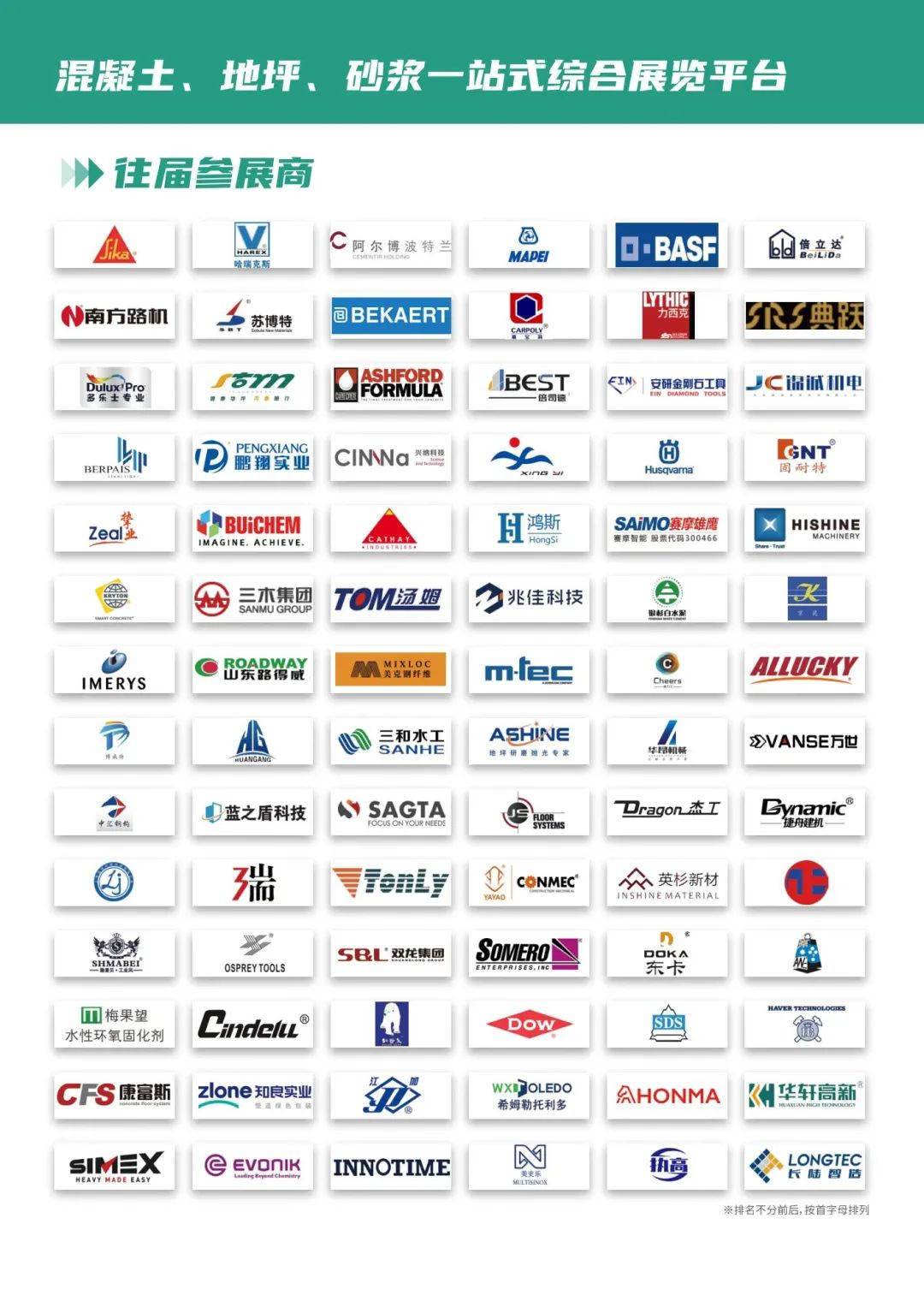 展品范圍:攪拌設(shè)備;混凝土運(yùn)輸;現(xiàn)澆混凝土;預(yù)制混凝土;混凝土預(yù)制產(chǎn)品等;混凝土切割設(shè)備,破碎設(shè)備,爆破技術(shù)等;耗材;礦山設(shè)備;廢棄混凝土再生處理設(shè)備及產(chǎn)品;混凝土外加劑;混凝土檢測(cè)儀器及設(shè)備;混凝土加固技術(shù)及設(shè)備;裝飾混凝土及顏料等;透水磚;水泥