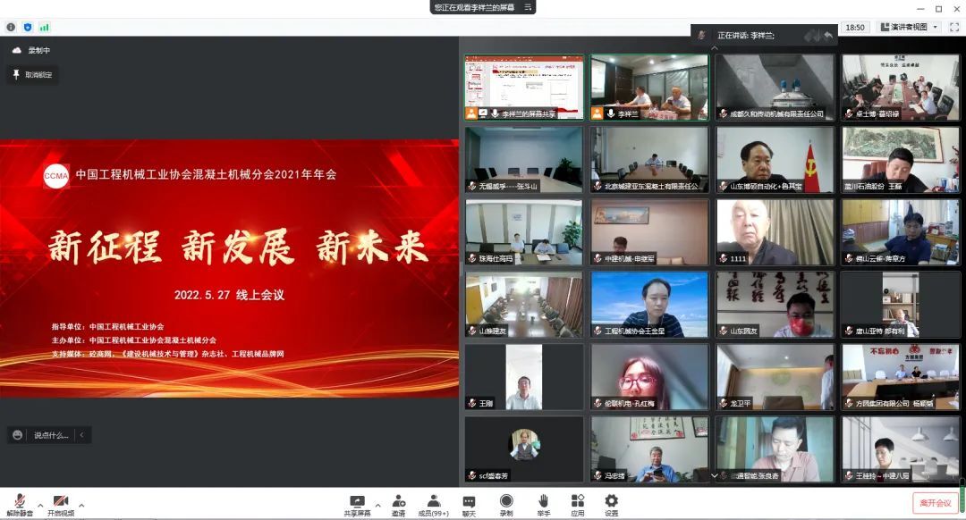 2022年5月27日,以“新征程 新發(fā)展 新未來 ”為主題的中國工程機(jī)械工業(yè)協(xié)會(huì)混凝土機(jī)械分會(huì)年會(huì)在線上隆重召開。中國工程機(jī)械工業(yè)協(xié)會(huì)會(huì)長蘇子孟、名譽(yù)會(huì)長祁俊、協(xié)會(huì)顧問龍國鍵、副秘書長呂瑩、副秘書長王金星、副秘書長尹曉荔、其他分支機(jī)構(gòu)領(lǐng)導(dǎo)、混凝土機(jī)械分會(huì)會(huì)長符忠軒、名譽(yù)會(huì)長盛春芳、秘書長李祥蘭、顧問易君、分會(huì)秘書處、分會(huì)理事及會(huì)員單位相關(guān)負(fù)責(zé)人、行業(yè)上下游企業(yè)與行業(yè)專家等在內(nèi)的兩百余人參與此次會(huì)議。
