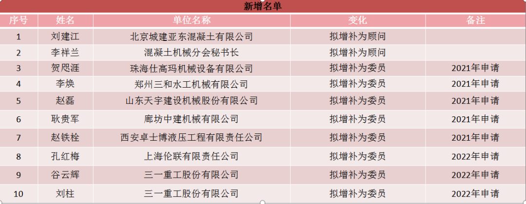 2022年4月29日經(jīng)混凝土機(jī)械分會(huì)理事會(huì)決議,團(tuán)標(biāo)委員增補(bǔ)10人,變更2人,取消2人。委員人數(shù)由31人調(diào)整至39人。