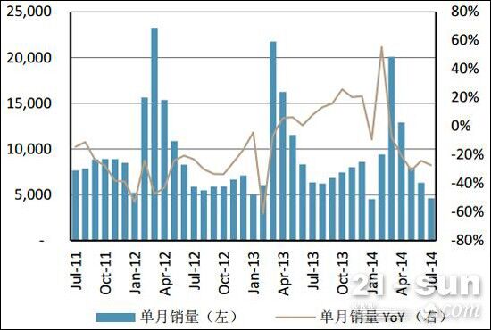 瑞銀表示,行業(yè)整體景氣度并未好轉(zhuǎn),下滑之勢未改。2013年4月開始,土方機(jī)械單月銷量增速由負(fù)轉(zhuǎn)正,其中挖機(jī)銷量在2013年四季度實現(xiàn)了超過20%的增長,裝載機(jī)在8月后亦實現(xiàn)了超過15%的月均銷量增長。但進(jìn)入2014年以來,由于房地產(chǎn)銷售及新開工不佳,2014年3月,挖掘機(jī)和裝載機(jī)銷量分別下滑8%和4%,結(jié)束了11個月的正增長。此后4-7月,跌幅持續(xù)擴(kuò)大,其中7月挖機(jī)銷量下降27%,裝載機(jī)銷量下滑20%。