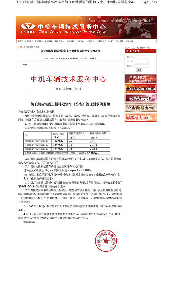 根椐國(guó)家有關(guān)依法治國(guó)的精神,嚴(yán)格執(zhí)行國(guó)家法律、標(biāo)準(zhǔn)的有關(guān)規(guī)定,中機(jī)車(chē)輛技術(shù)服務(wù)中心根據(jù)中國(guó)工業(yè)信息化部產(chǎn)業(yè)政策司意見(jiàn),印發(fā)中機(jī)函[2015]7號(hào)文向相關(guān)單位下發(fā)。此文明確了混凝土攪拌運(yùn)輸車(chē)三點(diǎn)技術(shù)要求(原文見(jiàn)附件),并于2015年7月1日前對(duì)公告產(chǎn)品進(jìn)行整改,逾期者將暫仃公告。椐此,特向全國(guó)廣大攪拌運(yùn)輸車(chē)生產(chǎn)商和使用者予以提示,希望大家認(rèn)真嚴(yán)格執(zhí)行。