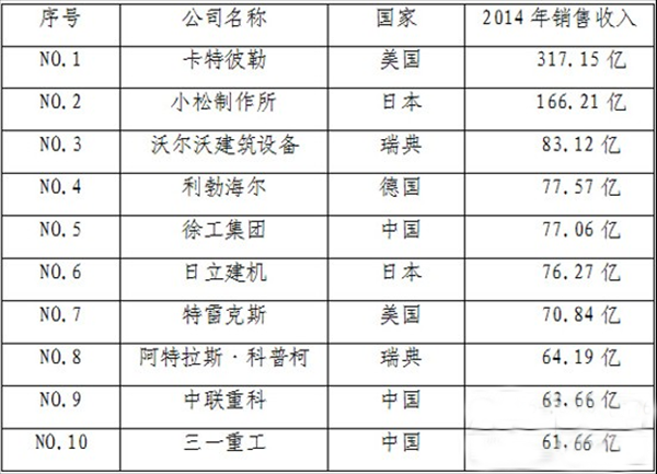 表1 2014全球工程機械制造商50強前10位 單位:美元