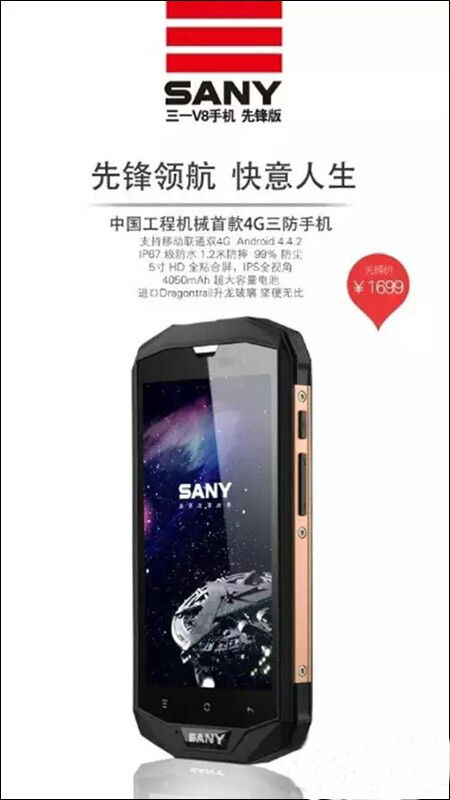 新一代的SANY V8手機(jī)是三一集團(tuán)與國際知名公司共同研發(fā)訂制的專業(yè)戶外三防手機(jī),達(dá)到國際IP67標(biāo)準(zhǔn)的防水、防塵和防震功能,同時(shí)該手機(jī)擁有1300MP像素高清拍照鏡頭,日本Dragontrail 升龍防壓防刮玻璃,5.0吋HD IPS全視角顯示頻,14.88毫米超薄合金機(jī)身,4050毫安時(shí)超大電池等亮點(diǎn)配置。該款手機(jī)設(shè)計(jì)源自德國,硬朗挺拔的外形設(shè)計(jì)非常獨(dú)特;手機(jī)心臟來自美國高通公司,內(nèi)置4核1.2G高速處理器,自帶1GB DDR3 RAM,8GB ROM,搭載了安卓系統(tǒng)4.4 kitkat原裝版本運(yùn)行軟件;手機(jī)采用了日本進(jìn)口的5.0吋Dragontrail升龍玻璃,不僅適合單手操作,而且玻璃經(jīng)過了鋼化,比蘋果手機(jī)的硬度高30倍;手機(jī)配備1300萬高清攝像頭,支持水下拍攝和視頻播放;手機(jī)電池專為戶外群體考慮,達(dá)到了驚人的4050毫安時(shí),官方表示能夠提供 10小時(shí)通話和288小時(shí)的待機(jī)時(shí)間??芍С蛛p4G流暢通話,TDD-LTE 4G(移動(dòng)4G,移動(dòng)2G)和FDD-LTE 4G網(wǎng)絡(luò)(聯(lián)通4G/3G/2G)、Wi-Fi、GPS以及microSD卡擴(kuò)展等功能。SANY V8先鋒手機(jī)的機(jī)身尺寸是155x80x14.8mm,重約238g。同時(shí),手機(jī)將提供沙漠金、星空黑和三一紅三種不同的配色,完美展現(xiàn)工程之美。