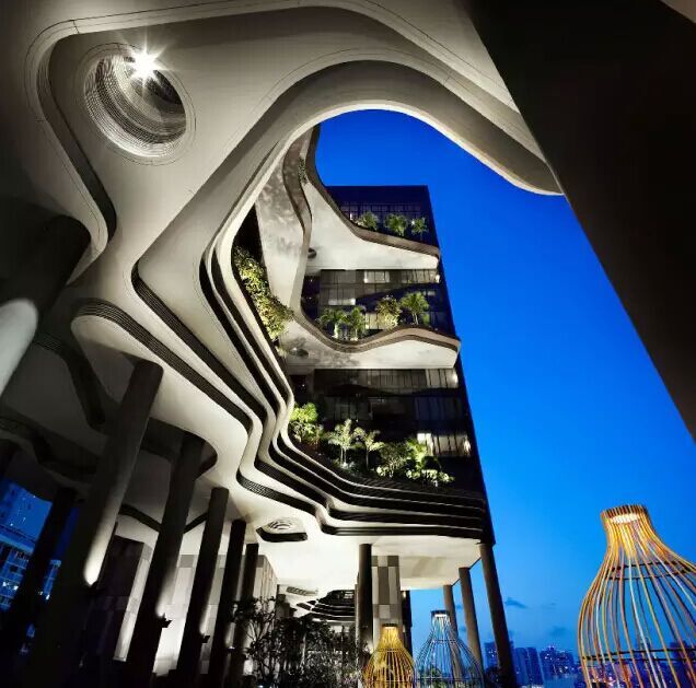 建筑流動的幾何體給人一種高聳入云之感,塔樓每隔三層客房擁有懸挑的空中花園,上面種滿了熱帶植物,它已成為城市綠地的一部分,與鄰近公園融為一體。酒店擁有自我遮陽功能,懸挑而出的空中花園和相鄰的三座酒店客房大樓都能起到遮陽的作用,客房樓層立面采用低輻射玻璃。酒店頂樓的屋頂花園可將全城風光一覽無余,獨家蘭花貴賓會所位處該層,并配有私人會議空間、圖書館和專用的貴賓會所門房。酒店五層設有可俯瞰城市的無邊界泳池,設備先進的健身中心,特色的鳥籠休息涼亭及長達300米花園走道。