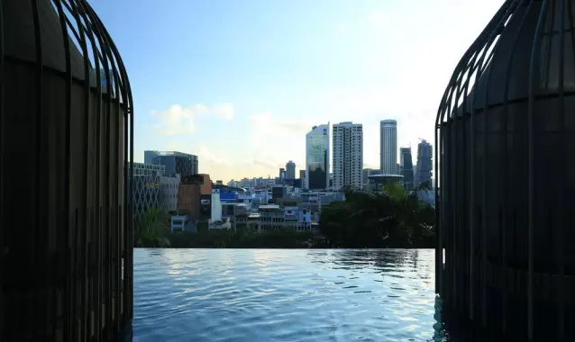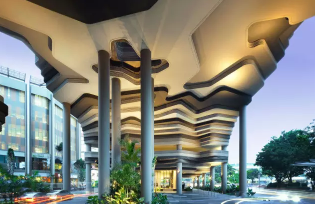 酒店位于其中心商業(yè)區(qū),是新加坡WOHA建筑事務所的杰作,負責景觀設計的為Tierra事務所。皮克林賓樂雅采用花園酒店理念,貫徹節(jié)能,已獲新加坡綠色建築最高榮譽BCA綠色建築白金獎,因其為首間使用太陽能酒店,獲得太陽能先鋒獎。酒店樓高16層,12層高的塔樓坐落在5層高裙樓樓頂上,塔樓每隔三層懸挑一座空中花園。裙樓被波狀預制混凝土包圍,WOHA稱之為地形建筑、會呼吸的建筑。