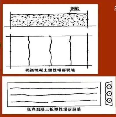 1塑性塌落裂縫塑性塌落裂縫,一般多發(fā)生在混凝土澆注過程或澆注成型后、混凝土初凝前發(fā)生,由于混凝土拌合物中的骨料在自重作用下緩慢下沉,水向上浮,即所謂的泌水,若是素混凝土,混凝土內(nèi)部下沉是均勻的,若是鋼筋混凝土,則混凝土沿鋼筋下方繼續(xù)下沉,鋼筋上面的混凝土被鋼筋支頂,使混凝土沿鋼筋表面產(chǎn)生順筋裂縫。大流動(dòng)性混凝土或水灰比較大的混凝土塑性塌落裂縫問題尤為嚴(yán)重。