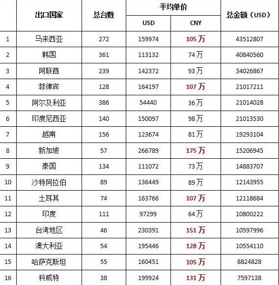 2015年1—11月我國塔機出口3098臺,同比減少14.68%,出口金額達到39303.24萬美元,同比減少6.95%,預(yù)計全年出口3300臺左右,相比國內(nèi)市場接近50%的銷量跌幅,塔機出口成績可嘉。尤其2015年上半年相比去年同期增長了16.7%,但從7月份開始逐月走低。從近10年的區(qū)域占比來看,中國塔機出口的市場一直由亞太地區(qū)市場占據(jù)絕對主力,從近三年的數(shù)據(jù)可以看出,雖然歷年各國排名都有變化,但除了俄羅斯聯(lián)邦、土耳其、巴西、阿爾及利亞等國家外,其他列于榜單中的國家全部位于亞洲區(qū)域,顯而易見,我國塔機出口主要市場依舊是亞洲等發(fā)展中國家。(具體參見下圖:2015年1—11月塔機出口數(shù)據(jù))