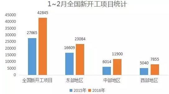 今年1~2月,全國(guó)新開(kāi)工項(xiàng)目42845個(gè),比去年增加15180個(gè)。其中,東部地區(qū)新開(kāi)工項(xiàng)目23084個(gè),增加6475個(gè);中部地區(qū)新開(kāi)工項(xiàng)目11900個(gè),增加5886個(gè);西部地區(qū)新開(kāi)工項(xiàng)目7855個(gè),增加2815個(gè)。