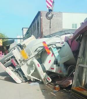 一輛江淮標(biāo)志的白色攪拌車(chē)在吊車(chē)的牽引下斜靠在墻上。據(jù)目擊者介紹,事發(fā)下午1時(shí)左右,當(dāng)時(shí)攪拌車(chē)正在倒車(chē),突然車(chē)右后輪下方的路面塌陷,攪拌車(chē)失去平衡,向右方翻倒,有兩名路過(guò)此地的行人躲閃不及,被壓在了車(chē)身下。