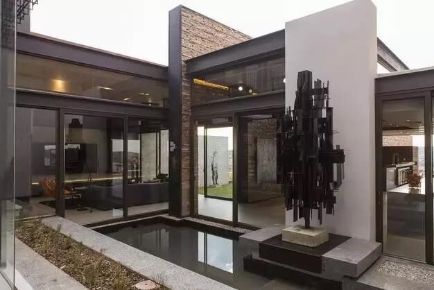 建筑師用鋼鐵,混凝土,玻璃為主要材料,結合就近取材的天然板巖和花崗巖,天然實木地板 ,打造了一個工業(yè)時代感的現(xiàn)代化豪宅,貫穿建筑的兩級錯落水景是設計中的主要亮點。