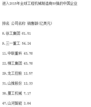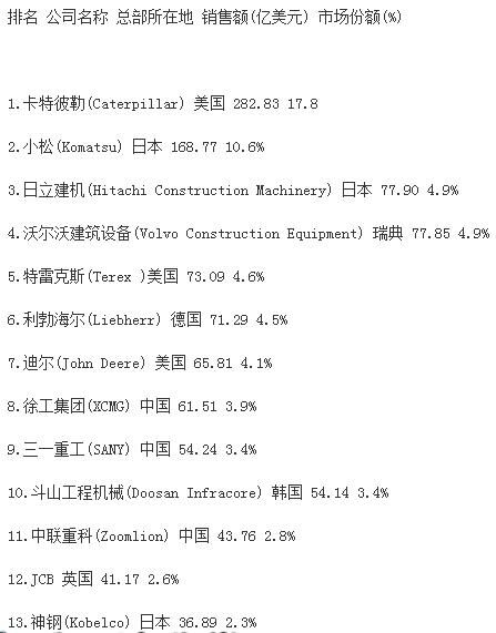 分析指出,受大宗商品價(jià)格下跌、新型經(jīng)濟(jì)體經(jīng)濟(jì)增速減緩和世界經(jīng)濟(jì)不景氣的影響,全球前50家工程機(jī)械制造企業(yè)總產(chǎn)值較上一年度下跌16.2%,達(dá)到1330億美元,創(chuàng)2009年以來新低。據(jù)中國工程機(jī)械商貿(mào)網(wǎng)編輯了解,2009年,工程機(jī)械行業(yè)一年銷售額下降了1090億美元。自那時(shí)起,工程機(jī)械行業(yè)收入下降趨勢(shì)一直未有改變。報(bào)告同時(shí)強(qiáng)調(diào),榜單上下滑最為嚴(yán)重的是中國企業(yè),這很大程度上是因?yàn)橹袊?jīng)濟(jì)增速的放緩。中國企業(yè)中,只有徐工集團(tuán)仍然保持在前十強(qiáng),位列榜單第九位。“這個(gè)市場(chǎng)趨勢(shì)表現(xiàn)最顯著的就是中國建筑設(shè)備制造商,相比去年,所有中國企業(yè)的排名有所下滑。排名前十的企業(yè)中,如今只有徐工一家中國工程機(jī)械制造廠商?!?/span>