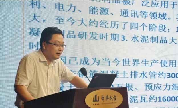 ▼ 中國混凝土與水泥制品工業(yè)協(xié)會排水管專家褚建中做“綜合管廊及海綿城市的預制混凝土構件”的演講;